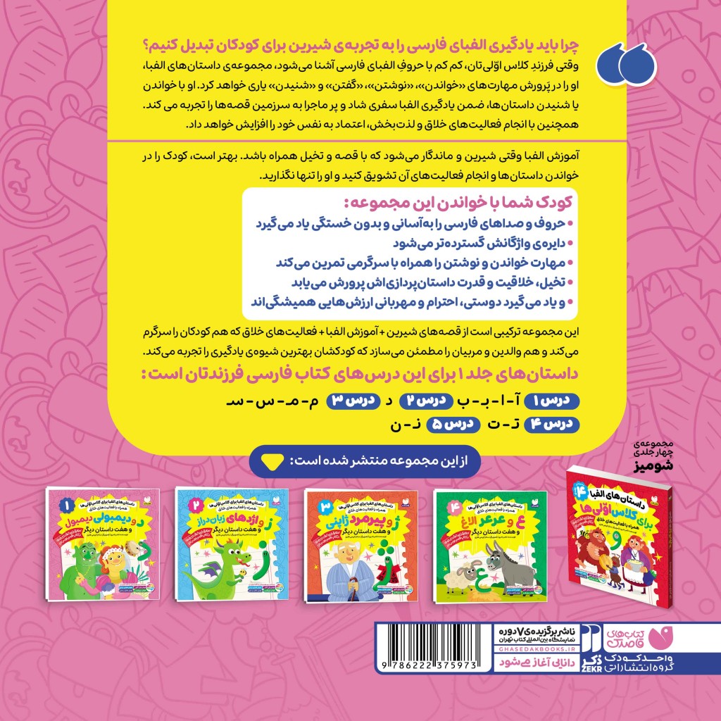 وقتی فرزندِ کلاس اوّلیتان، کم کم با حروفِ الفبای فارسی آشنا میشود، مجموعهی داستانهای الفبا، او را در پَرورش مهارتهای «خواندن»، «نوشتن»، «گفتن» و «شنیدن» یاری خواهد کرد. او با خواندن یا شنیدن داستانها، ضمن یادگیری الفبا سفری شاد و پر ماجرا به سرزمین قصهها را تجربه می کند. همچنین با انجام فعالیتهای خلاق و لذتبخش، اعتماد به نفس خود را افزایش خواهد داد.
